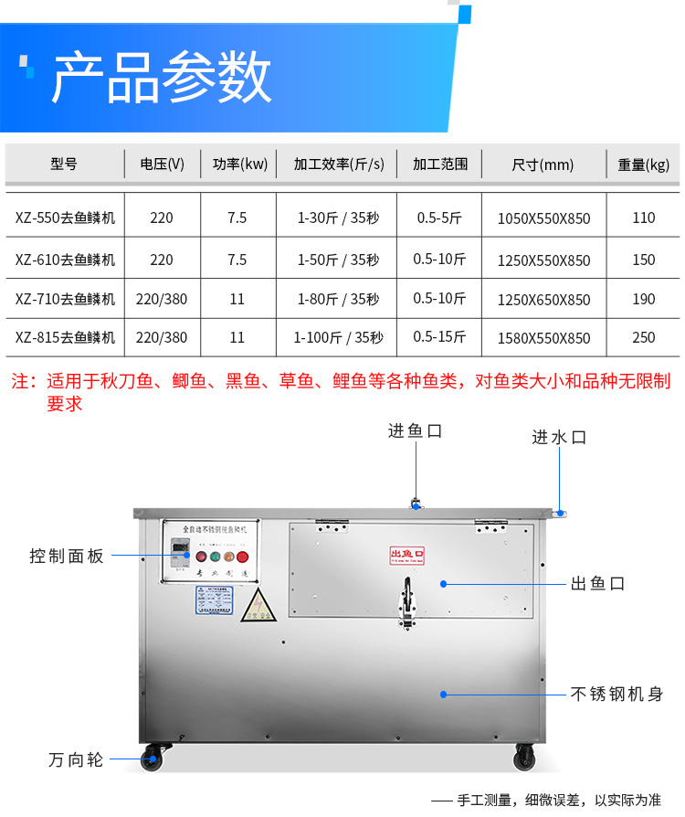 型號 | XZ-550去魚鱗機 | XZ-610去魚鱗機 | XZ-710去魚鱗機 | XZ-815去魚鱗機 |